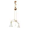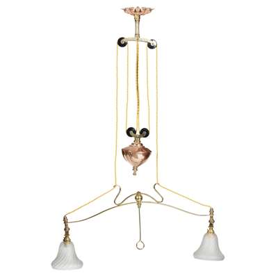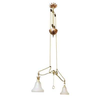 the serrated ceiling rose above a weighted pulley and two whiplash arms suspending frosted glass shades, stamped maker’s marks BENSON