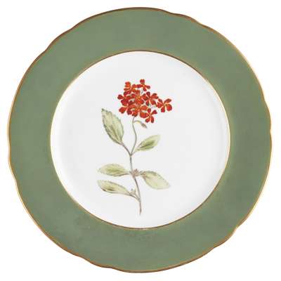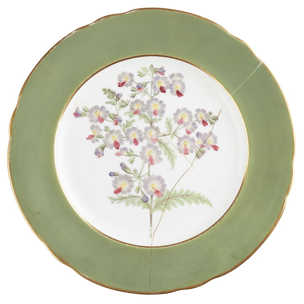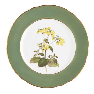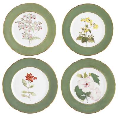 each painted with central flowers, depicting verbena, hibiscus, schizanthus and calceolaria, within green borders with gilt rims, with puce marks verso, with Latin names of flowers and printed FAVERSHAM HORTICULTURAL AND FLORAL SOCIETY PRIZE/ ESTABLISHED AD 1836/ DAVENPORT/ LONGPORT (one a/f) (4)