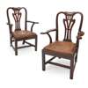 the shaped top rails above pierced and carved vase-shaped splats with scrolled roundels and leather upholstered seats, raised on square straight legs united by H-form stretchers, comprising two carvers and six side chairs (8)
