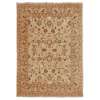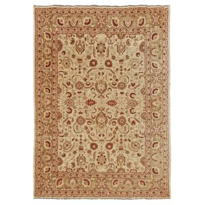 the cream field with stylised palmettes and foliage in red, pink and green, within a light brown palmette, rosette and vine border