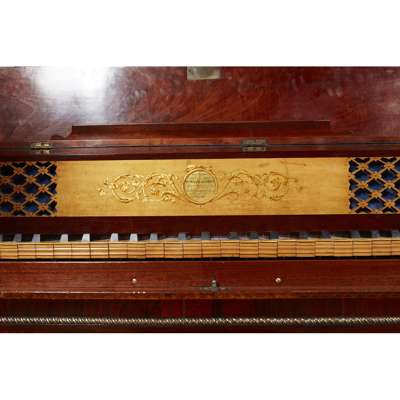 the D-shaped case opening to painted nameboard NEW PATENT WM. ROLFE AND COMP. Y./ MASTERS/ 112 CHESAPEAKE/ LONDON, with ebony and ivory keys above two short and one long drawer, raised on spiral carved legs with brass caps and castors, with decorative triangular inlaid banding and gilt brass mounts, recently refurbished
