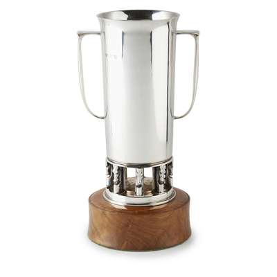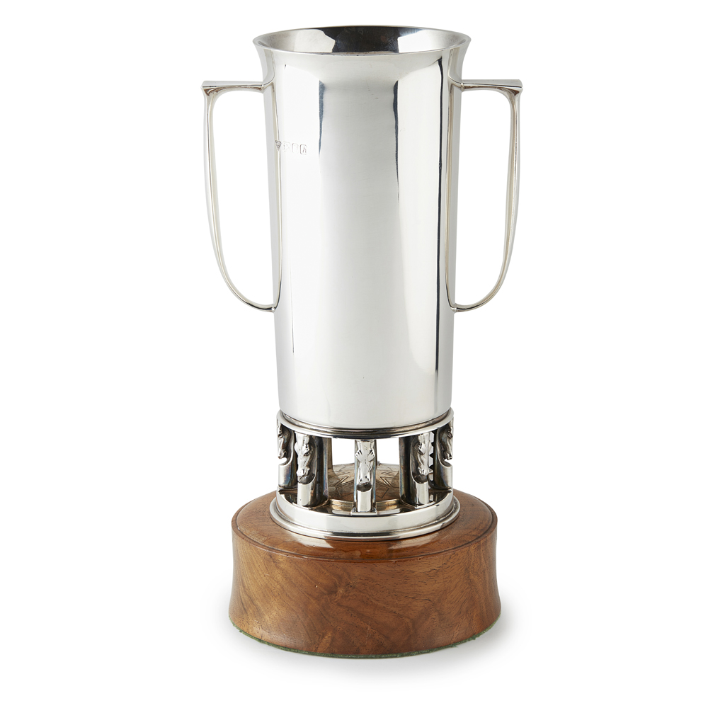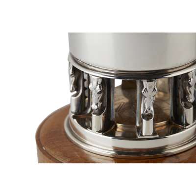 of cylindrical form with everted rim, the domed base chased with star and lozenge design with openwork supports cast as horses' heads, raised on a walnut stand, stamped maker’s marks, G&CO. LD., hallmarked London 1963
