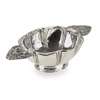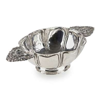the slightly lobed bowl with simple panel decoration and punchwork detail, the flat handles of chased and pierced form of two embracing putto amongst flowers, indistinctly marked
