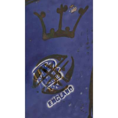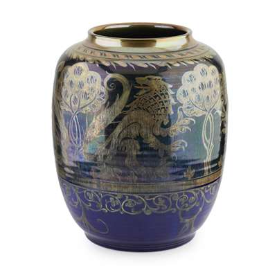 decorated with a frieze of lions rampant and stylised trees on a blue ground, painted artist’s and date cyphers to the base, impressed factory monogram and marks IX/ ENGLAND, bears paper label with inscription LL/ 6705