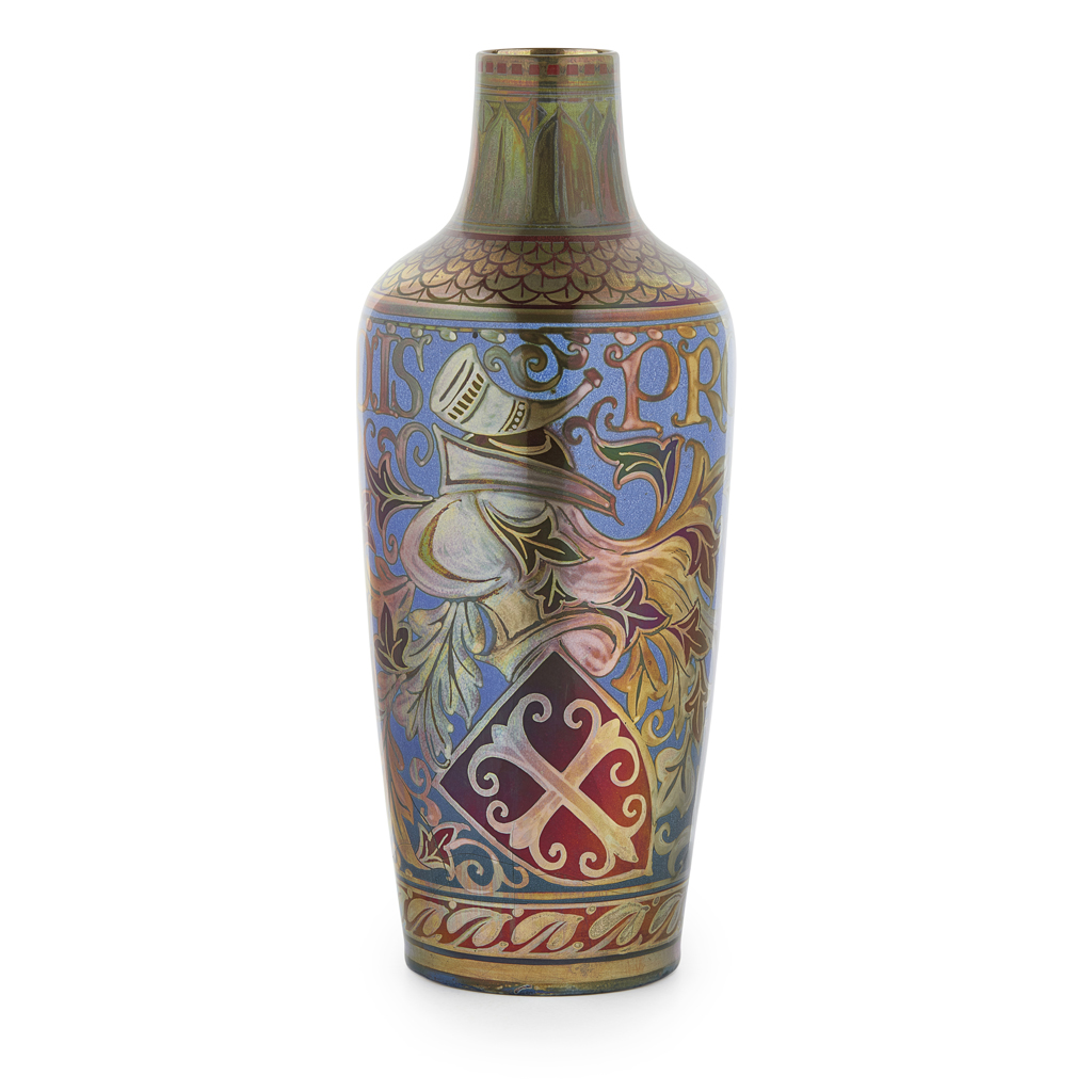 decorated with an armorial device and bearing inscription PRO ARIS ET FOCIS, painted artist’s cypher and dated 1920 to the base, impressed factory monogram and marks 2869/ ROYAL LANCASTRIAN/ ENGLAND