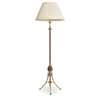 the turned and knopped adjustable column with leafy collar to the base and curved legs with ball terminals, linked by stretchers, with pleated silk shade