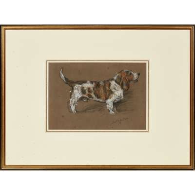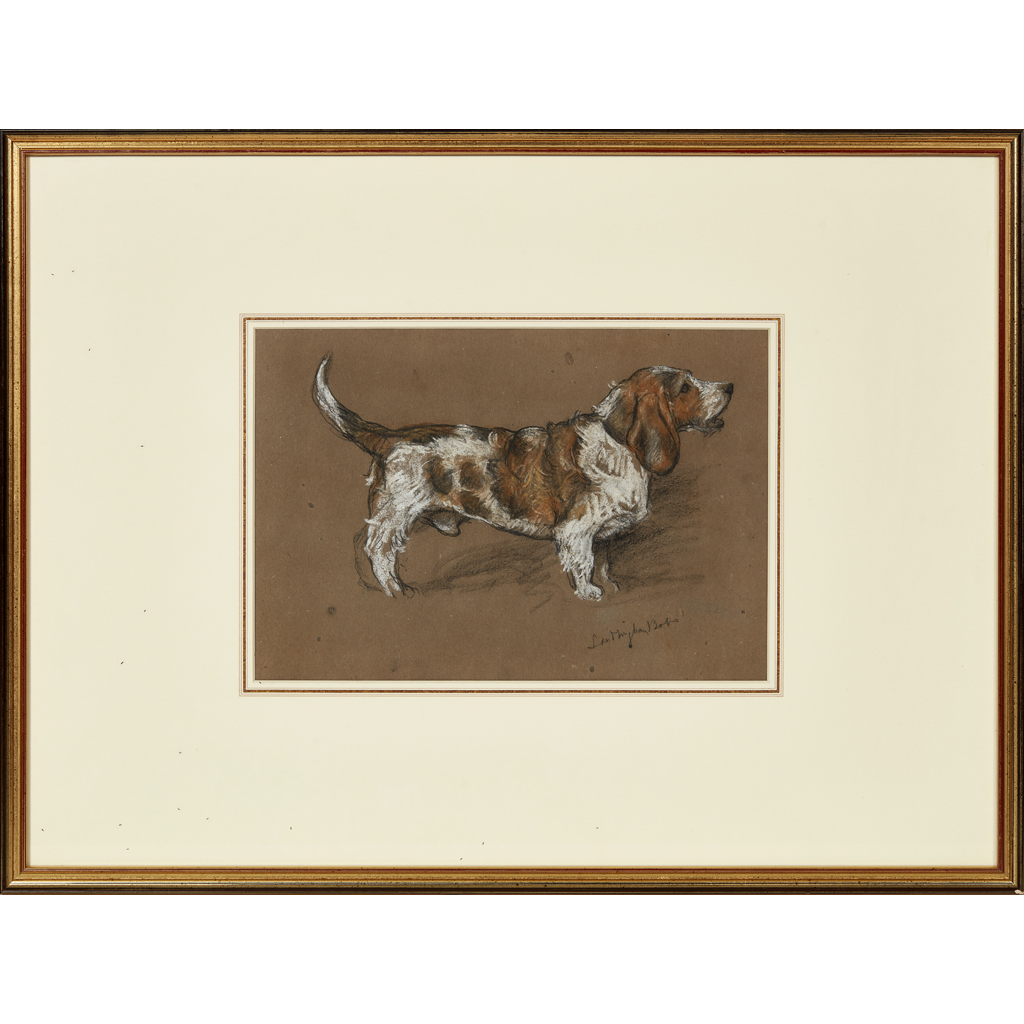 Note: The subject of this pastel study by Wardle belonged to Queen Alexandra, who owned a number of notable bassets including Sandringham Babel and Sandringham Bobs.