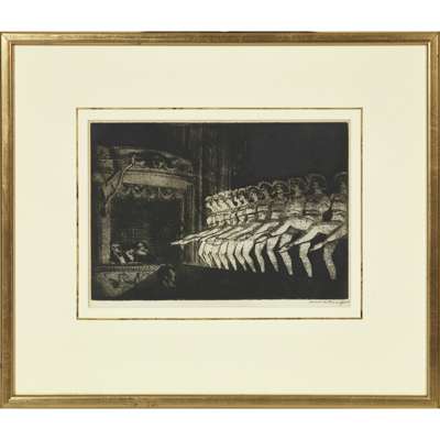 As well as popular entertainment, Knight also engaged with cutting edge performances in the art world; the drypoint etching Make Up is a portrait of Lubov Tchernicheva, the prima ballerina in the Ballet Russes's debut matinée peformance of Cleopatra at the London Colisseum. Sergei Diaghilev's Ballet Russes was instrumental in introducing European modernism to Britain and captured the imagination of many artists with Coco Chanel and Pablo Picasso designing costumes and French avant garde artists like Henri Matisse designing the set productions. However, instead of focusing on the drama of the performances themselves Knight was permitted backstage access to capture the unseen and private lives of the dancers. In Knight's autobiography Oil Paint and Grease Paint she highlights just how privileged she was recalling that ''No outsider but myself then haunted the stage''. This etching reveals the close relationship Knight shared with the performers; here she observes Tchernicheva carefully applying khol eyeliner for her role as Cleopatra in which she wore an Egyptian headdress designed by Sonia Delaunay. Knight stated 'there was to be no conversation; it was to be as if I did not exist' and it was this unobtrusive approach which enabled Knight to capture such quiet contemplative moments and that gives her etchings their intimate appeal.