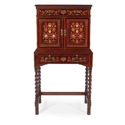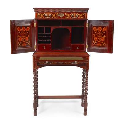 with marquetry decoration in specimen woods and mother-of-pearl and with ripple mouldings, the projecting cornice over divided drawer and two panelled doors, opening to reveal an interior fitted with drawers and pigeonholes and raised above a writing slide with tooled leather surface, with single drawer below raised on barley twist and blocked legs with corresponding stretchers, the locks stamped S&P/ B