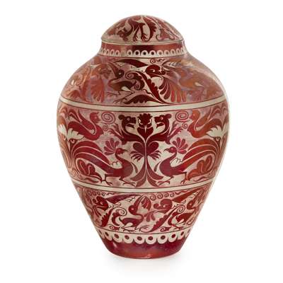 decorated with bands of exotic birds and foliage, impressed Sands End mark to base, bears Morris & Co. retailer’s label MORRIS & COMPANY/ 17 ST. GEORGE STREET, HANOVER SQUARE/ R.206/ D.M. LUSTRE/ VASE & COVER/ C P.LY.Y. £20