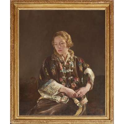 This painting is one of the celebrated 'Jane' series and was first exhibited at the Royal Academy's 178th Summer Exhibition in 1946, then later again at the Royal Academy's Exhibition of Works by Sir Gerald Kelly in 1957. Kelly was said to relish the challenge of rendering contrasting materials with a high degree of finish and this picture exemplifies Kelly's abilitiy to use oil paint's illusionistic properties to render a variety of textures. Jane is depicted seated against a plain dark background which accentuates the opulence of her clothing and Kelly has suceeded capturing the subtle sheen of Jane's oriental silk robe decorated with floral motifs and the softness of her fur collar. Kelly acknowledged James McNeil Whistler as an early influence and Kelly's attention to decorative oriental materials echoes the elaborately detailed paintings by Whistler such as Princess From the Land of Porcelain (1863-64) that celebrated Japanese visual culture and was a major source of inspiration for the Aestheticism movement at the end of the nineteenth century.