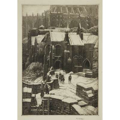 Note: Frederick Landseer Maur Griggs R.A., R.E. was one of the leading etchers and illustrators of the twentieth century whose meticulous technique and eye for architectural detail was unparalleled. Griggs studied at the Slade School of Art before going on to work as an architectural draftsman at C.E. Mallow's architecture firm from 1896 to 1898 where he was especially valued by leading architects of the Arts and Crafts fraternity for his skills in persepctive. In 1903 Griggs settled in the village of Chipping Campden in the Cotswolds, the centre of William Morris's Arts and Crafts Movement. Griggs was heavily influenced by the movement and his passion for locality and knowledge of vernacular architecture can be seen in this collection of etchings which feature rural townscapes depicted to such a high level of detail that every crumbling brick can be seen, transporting the viewer to a bygone age. Griggs worked within the English Romantic tradition and his etchings have a similar nostalgia to Samuel Palmer's pastoral landscapes but instead visualise the grandeur of England's historic architecture leading critics to describe his atmospheric compositions as ''poetic''. Figures in The Almonry wander in a landscape dominated by monumental Gothic facades, pointed arches and spires which reach skyward out of the frame while other etchings like Sellenger are unpopulated, leaving the crumbling buildings preseved in a tranquil silence. These etchings reflect a desire to preserve the gothic and medieval architecture of England's communities which Griggs feared to be endangered as a result of the Reformation of the sixteenth century, the Industrial Revolution of the nineteenth century and the First World War of the twentieth century.