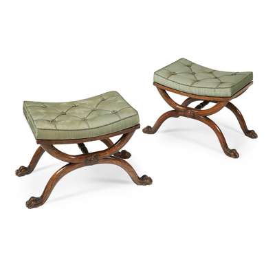 the curved upholstered green silk button seats, raised on X-form supports terminating in paw feet, grain-painted to simulate rosewood (2)