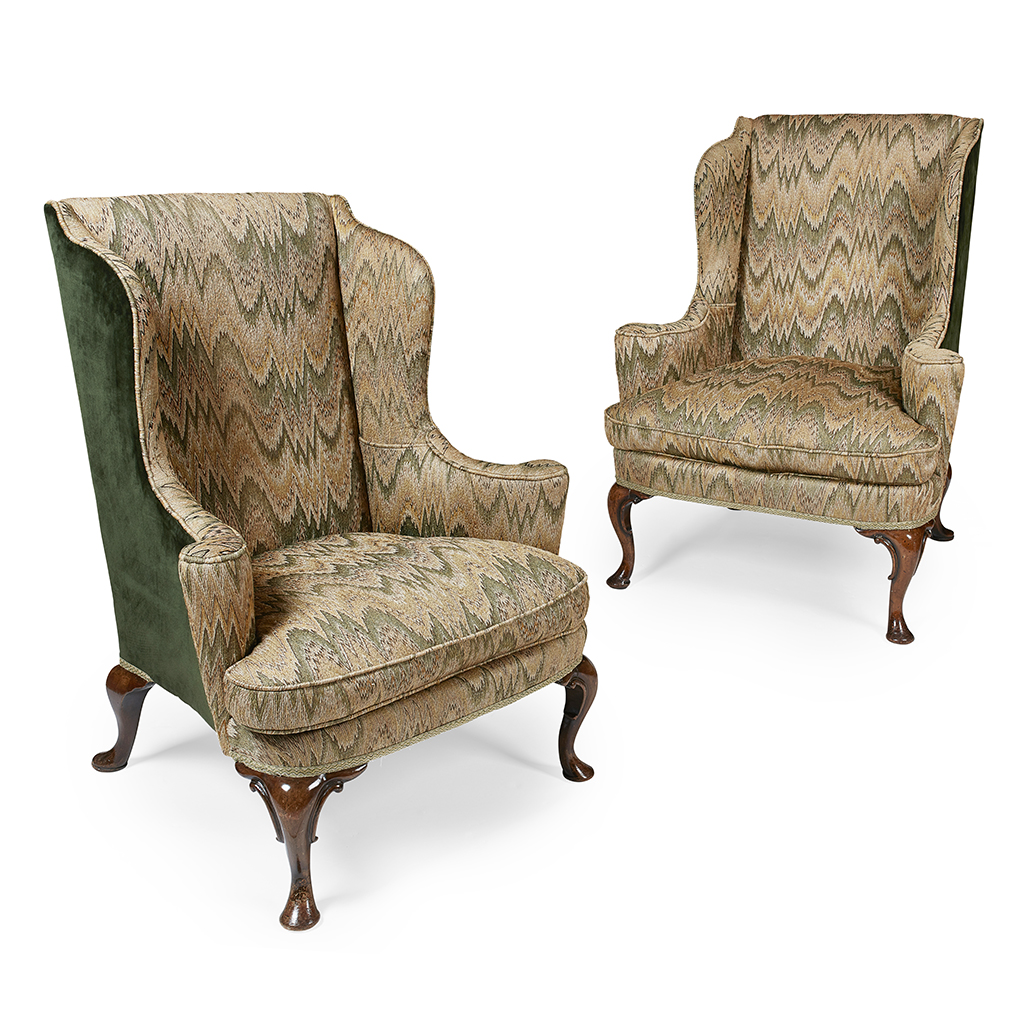 with straight backs, curved wingbacks and scrolled arms above loose cushions, raised on four cabriole legs with carved C-scrolls, with associated 18th century Bargello flame stitch fabric (from Lady Hamlyn) with later green velvet sides and backs, traces of old American trade labels (2)