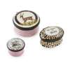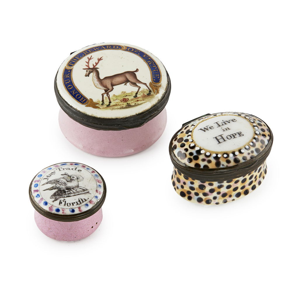 comprising an oval example with inscription WE LIVE IN HOPE, on a spotted ground, the void interior with a mirror to the lid, 4cm diameter; a round box, depicting a stag with gilt inscription HONOUR THE REWARD OF VIRTUE, above a pink base, also with interior mirror, 4.5cm diameter; and a small circular box, depicting a dove and the inscription MAY TRADE FLORISH, also with a pink base, 2.5cm diameter (3)