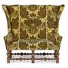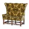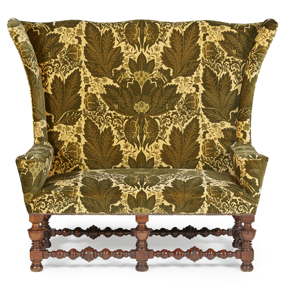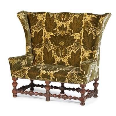 in the William and Mary style, the shaped back and splayed ears above two outscrolling arms, raised on turned baluster legs and bobbin-turned stretchers, with squat bun feet, in later Watts of Westminster 'Welbeck Velvet' upholstery in 'Sherwood Green'