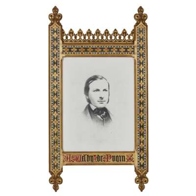 with fleur-de-lis finials and pierced gallery, painted with bands of rosettes and bearing inscription A. WELBY DE PUGIN