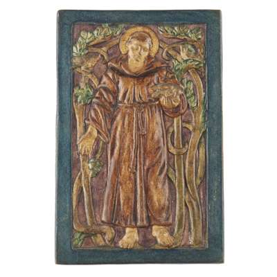 POTTERY PLAQUE OF ST FRANCIS, CIRCA 1920