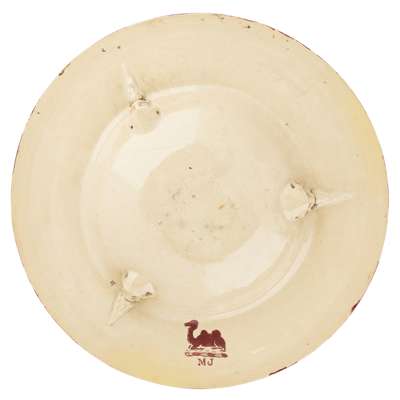 decorated with swimming fish within a floral and foliate rim, decorated verso with three masks and bearing camel maker’s mark and initials MJ (Maw/ Jackfield)