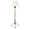 the knopped column support with applied leafy brackets to the capital, raised on quadruped base linked by stretchers and mounted with an orb weight, later pleated silk shade