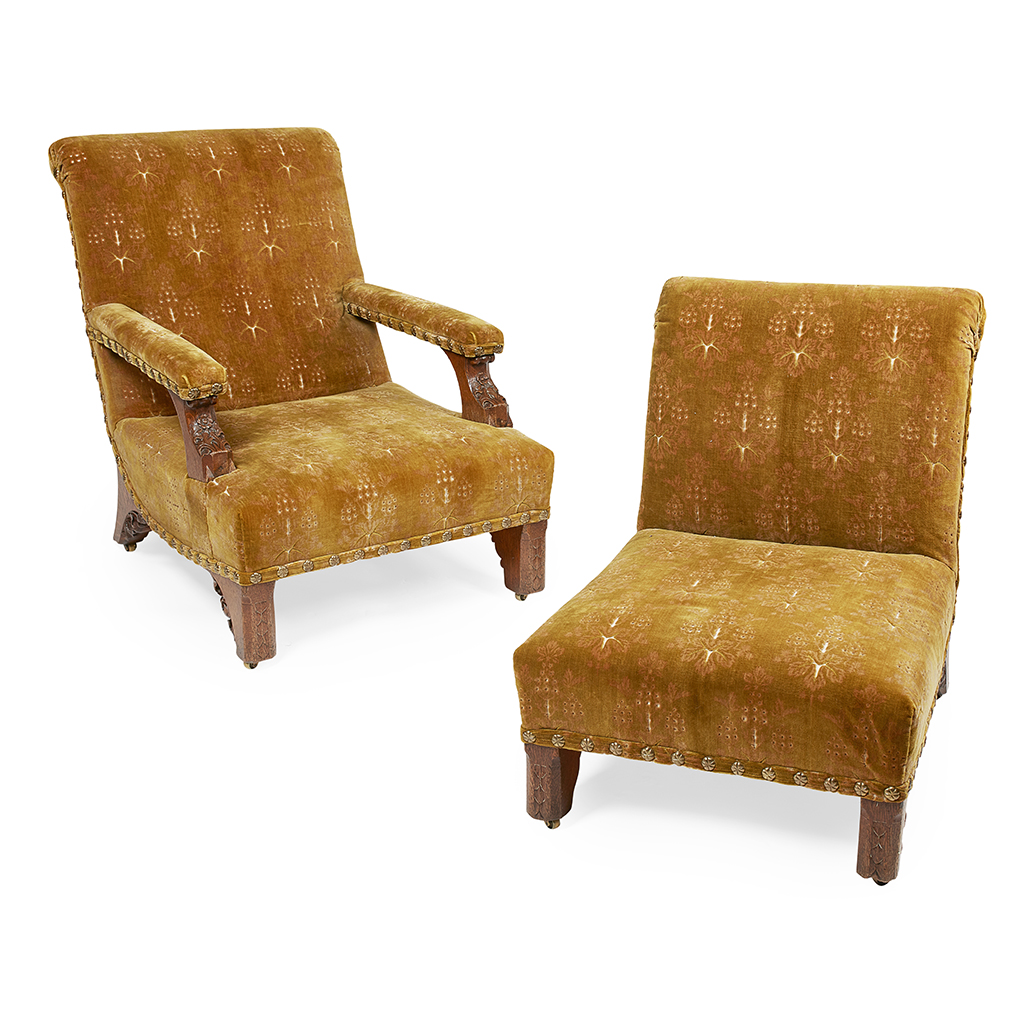 TWO GOTHIC REVIVAL OAK-FRAMED LOW EASY CHAIRS, CIRCA 1880