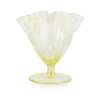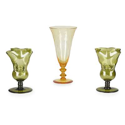 the frilled tapering body with short stem raised on a spreading base, 11cm high; also a PAIR OF JAMES POWELL & SONS GREEN GLASS VASES, CIRCA 1890, each with frilled rim, short stem and spreading base, 19cm high; and a VICTORIAN GLASS STEMMED VASE, amber glass, 28cm high (4)