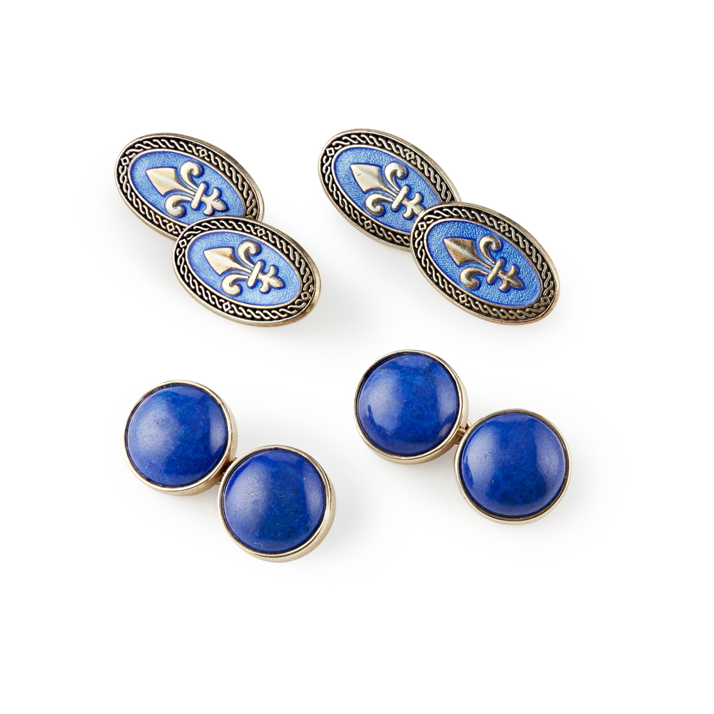 the first pair with circular terminals collet set with lapis lazuli cabochons, modelled in 9ct gold; the second pair modelled in silver with fleu-de-lis details and blue enamel detail to oval terminals (2)