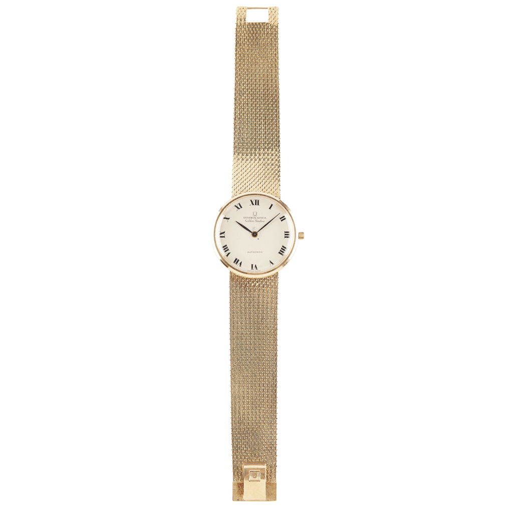 the golden coloured dial with Roman numerals, marked UNIVERSAL GENÈVE/ GOLDEN SHADOW/ AUTOMATIC/ SWISS MADE, with an integral gold bracelet hallmarked 14ct gold, marked DS & S, with a spare glass face
