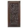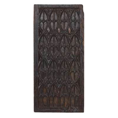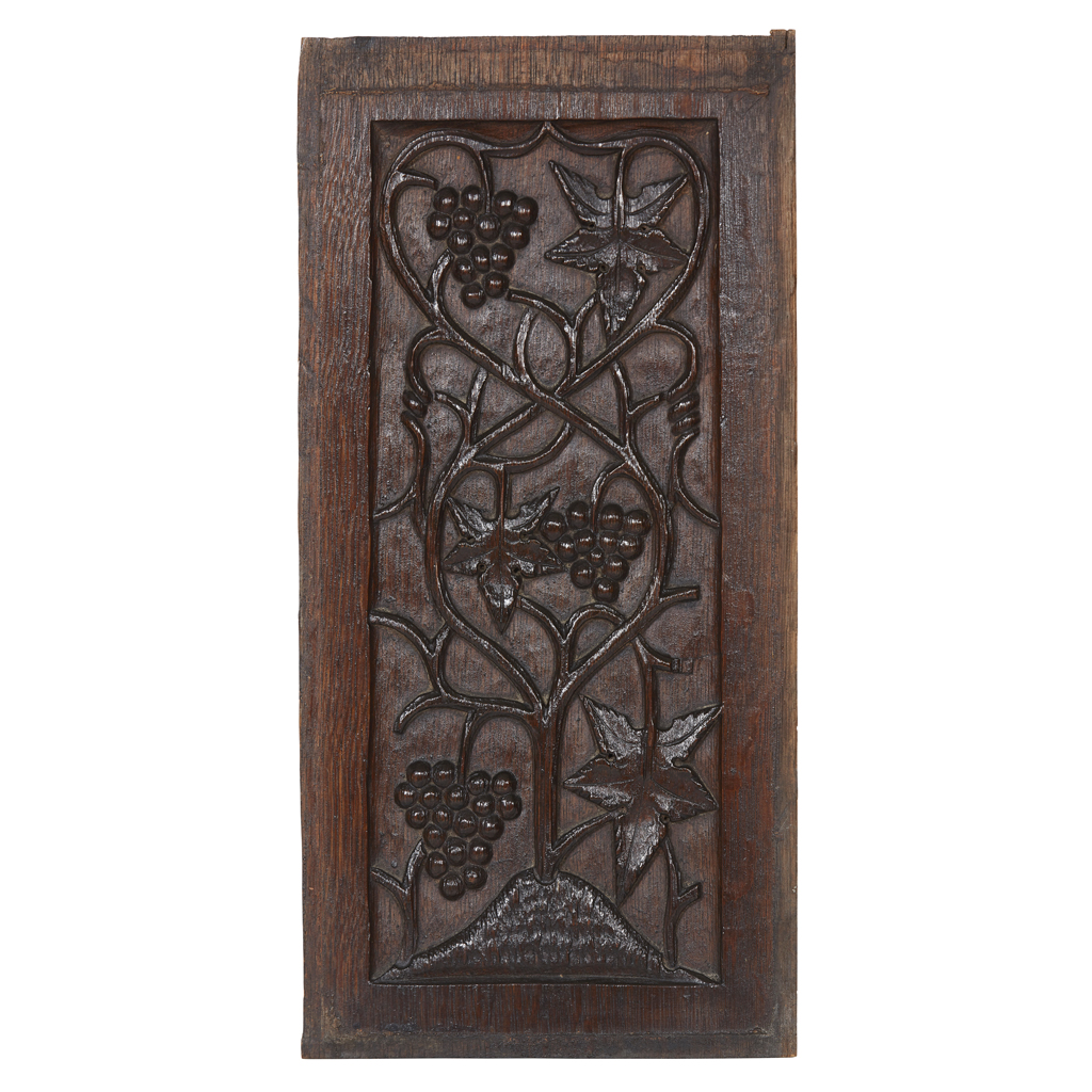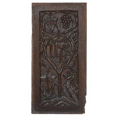 comprising two of similar design depicting fruiting vines, one carved with a parrot, carved with initials IHS; 46.5/47cm x 23cm; and a further panel, carved with a repeating faux window pattern with fleur-de-lis, of gothic design, 43cm x 25cm (3)