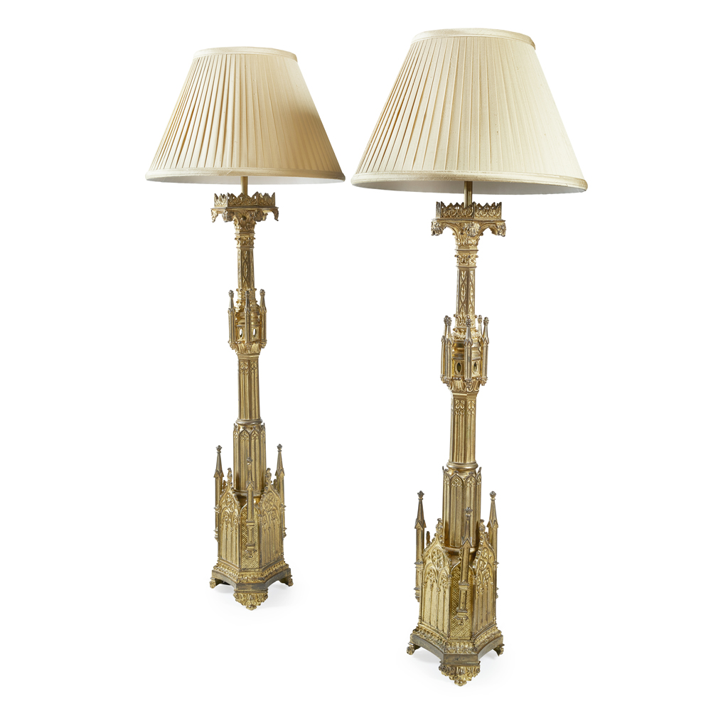 PAIR OF VICTORIAN GOTHIC REVIVAL GILT METAL TABLE LAMPS