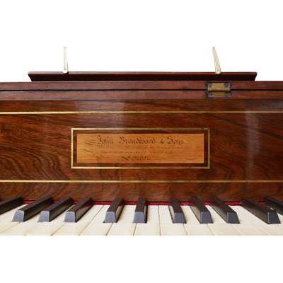 the rectangular banded top opening to nameboard JOHN BROADWOOD & SONS/ MAKERS TO HIS MAJESTY AND THE PRINCESSES/ GREAT PULTENEY STREET/ GOLDEN SQUARE/ LONDON, and ivory and ebony keys above knopped and reeded tapered legs with gilt brass collars and brass caps and castors, retains original painted wood dust cover to the interior