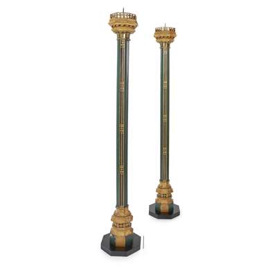 each of octagonal section with gilt and polychrome decoration, the moulded capitals with pierced gallery above tall column support on a corresponding moulded base with later plinth (2)