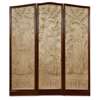 with moulded mahogany frame, each panel worked in crewel-stitch in gold, green and brown threads on a cream silk satin ground and bearing inscriptions VENUS/ JUNO/ MINERVA