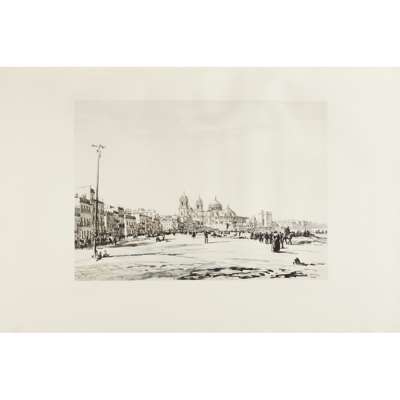Large folio, copy 185 of 265, 3 volumes, volume 1-2 contemporary morocco, volume 3 matching quarter morocco, 119 plates, 2 loose prints and an original preparatory sketch for tailpiece on page 58 of Muirhead Bone’s Old Spain (3)