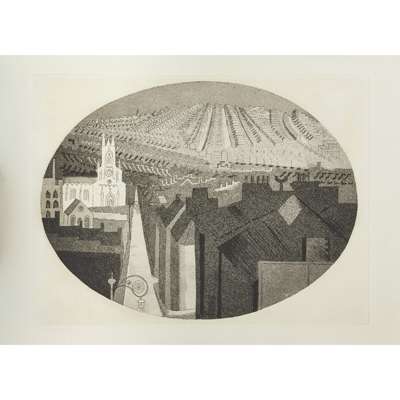 Note: John Piper's first sketches, taken as a child before the outbreak of the First World War, were chiefly architectural. He drew the monuments and buildings around his home in Epsom, even turning the work into handmade guidebooks . As an adult, his artistic output ranged from stained-glass to prints, to work with textiles . However, architecture, and the landscape complete with its human constructions, seems to remain a central theme throughout Piper's career.