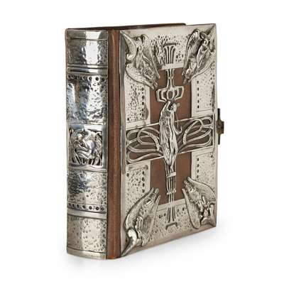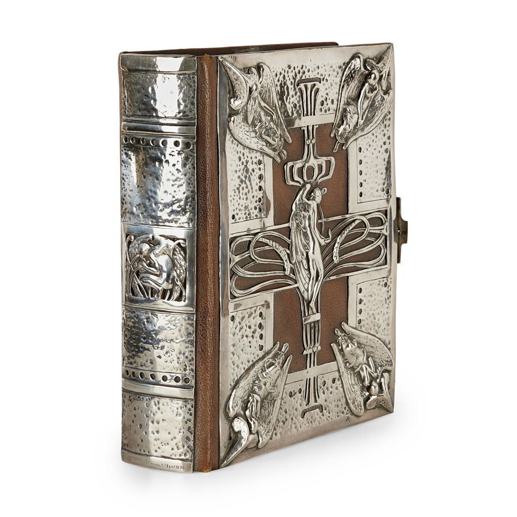 Blank album in highly decorative electroplate embossed covers, over morocco or seal leather, showing an Art Nouveau fruit and floral pattern with central figures of angels to each cover, and four angels emerging from chrysalises on each cover, signed ‘Art Union of London 1896’ to covers [see Marianne Tidcombe, 'Women Bookbinders', p.89]