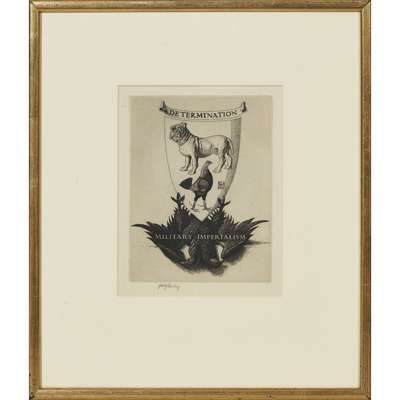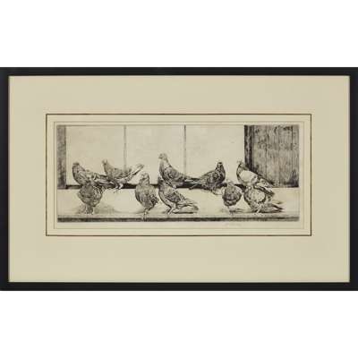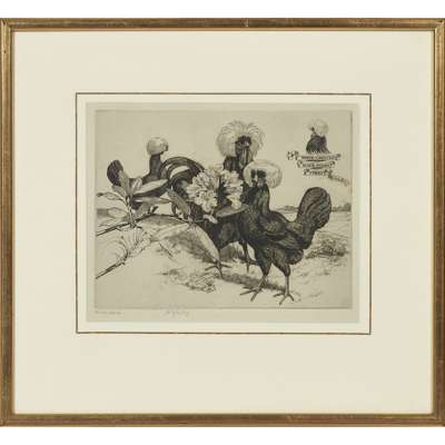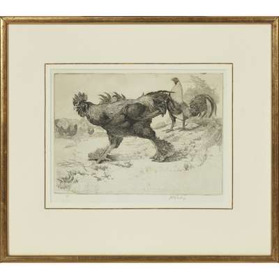 36cm x 26cm (14.25in x 10.25in) and four further etchings by the same hand ‘Rooster Crowing,’ ‘White-Crested Black Polish Fowls,’ ‘Military Imperialism’ and ‘Members of the Flying Corps’ (5)