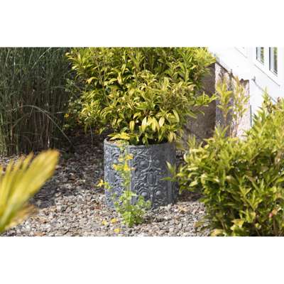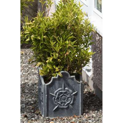 the first of square form, with arched top, cast with Tudor roses, 30cm wide, 38cm high, 30.5cm deep; the second of cylindrical form, cast with panels of rococo scrolls and flower heads, 34cm diameter approx, 32.5cm high (2)