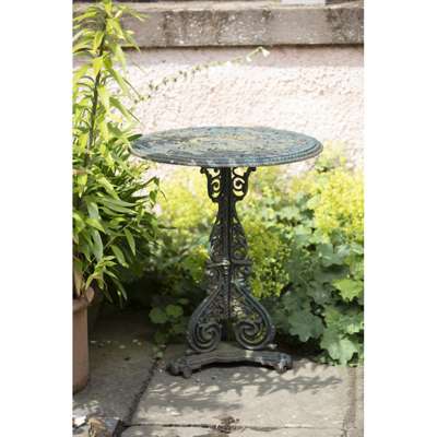 the pierced circular top, raised on a scrolling tripod base cast with flowers and scrolls, green painted
