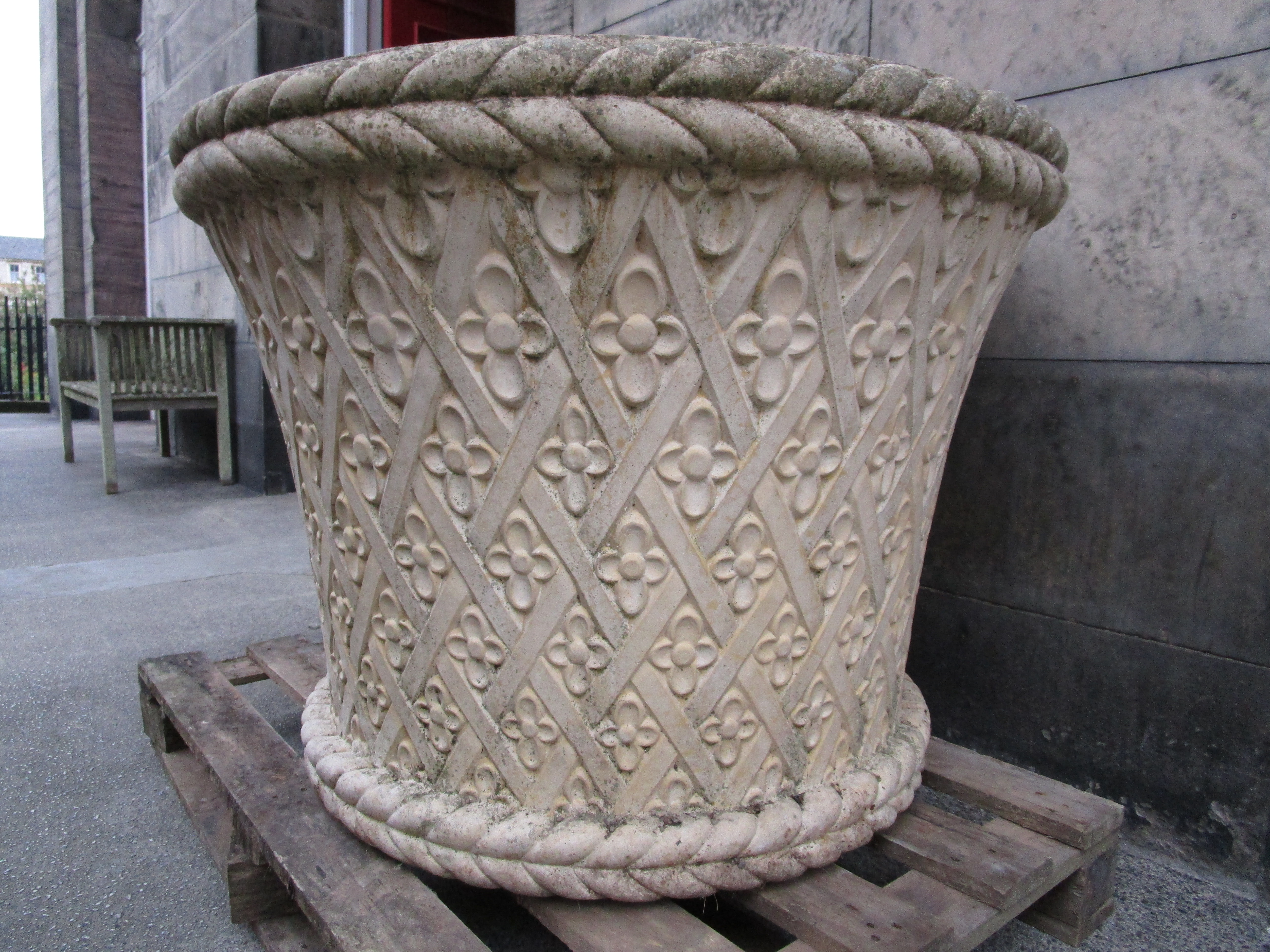 of slightly flared form, with rope-twist border above a lattice base