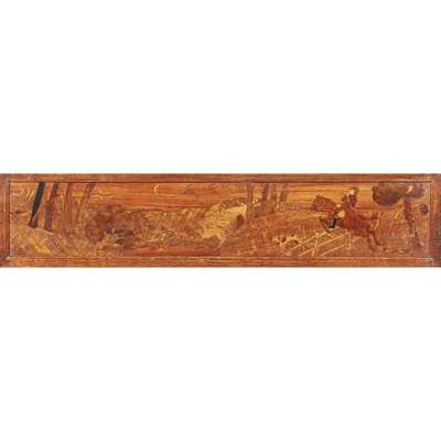 Note: This chest was made as part of Lorimer’s wedding gift to his sister, Janet, on her marriage to Sir David Chalmers. One of Lorimer’s early furniture designs, the inlaid panel displaying similarities with another early chest with a hunting scene which Lorimer displayed at the Arts & Crafts Exhibition in London in 1893. Other inlaid furniture followed for clients, including R.W. Mackenzie at Earlshall and, as in this example, Lady Chalmers.