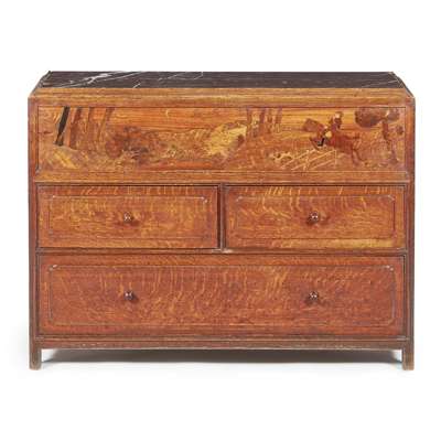 ARTS & CRAFTS OAK AND MARQUETRY INLAID CHEST OF DRAWERS, CIRCA 1895