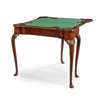 The fold-over top with outset rounded corners, opening to a green baize playing surface with counter wells, raised on shell carved cabriole legs ending in pad feet