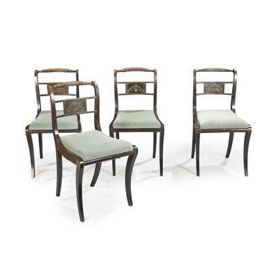 A SET OF FOUR REGENCY EBONISED AND BRASS MOUNTED CHAIRS