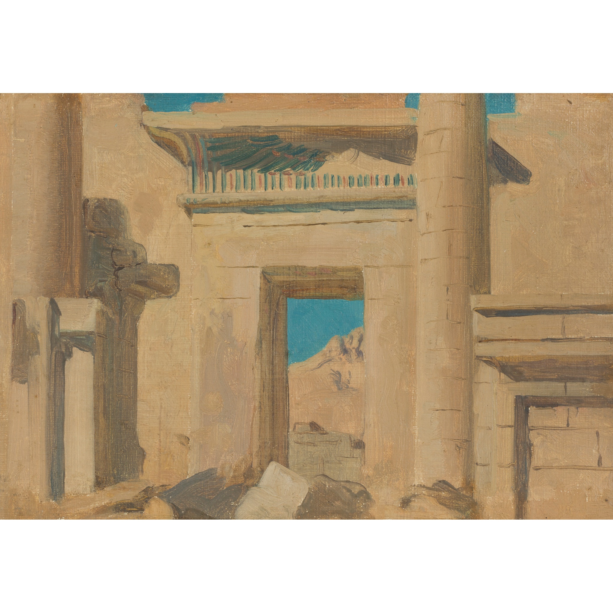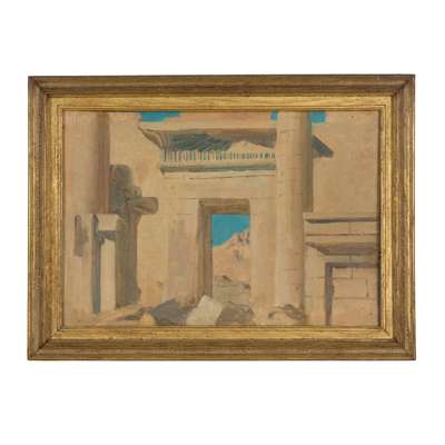 This is the only known architectural study painted by Corbet during his voyage up the Nile in the winter of 1878-9, and perhaps entered the collection of Vereker and Lilian Hamilton, Corbet’s fellow students at the Slade, as a token of friendship. As another study produced in the same month and also painted on canvas which was then laid on board, Desert Afternoon (Fondation Custodia, Collection Frits Lugt, Paris), it exemplifies Corbet’s practice of dating his open-air pieces. As his subject the artist unconventionally chose a gateway leading toward the Pavilion of Rameses III at Medinet Habu in Luxor, rather than to the site’s main temple. Having recently stayed with Frederic Leighton in Perugia, Corbet’s style displays his influence in the dynamic, imploding composition with a distant glimpse of the blue sky as well as in the characteristic brushwork which he might have seen in the sketches that Leighton himself painted on the Nile in 1868.