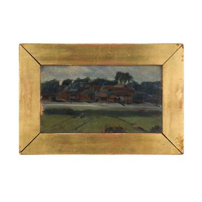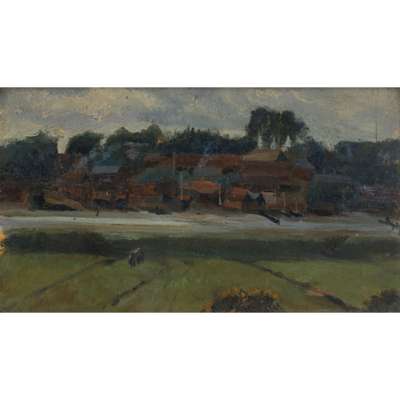 A RIVER LANDSCAPE WITH BOATYARD