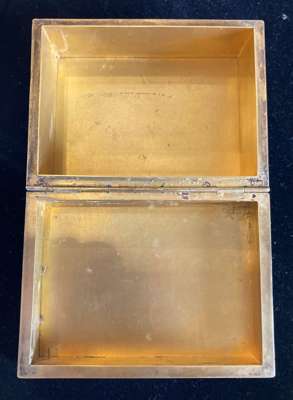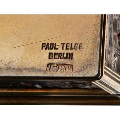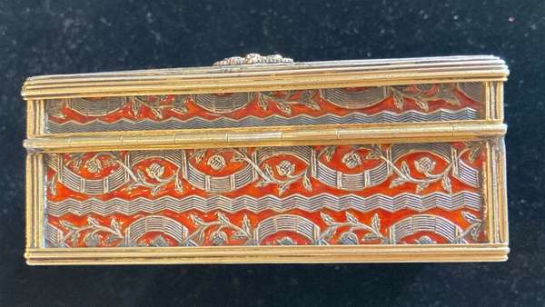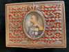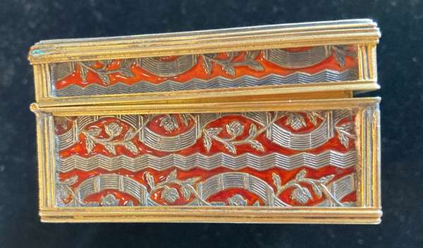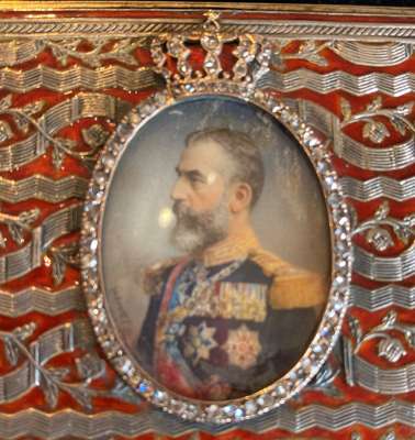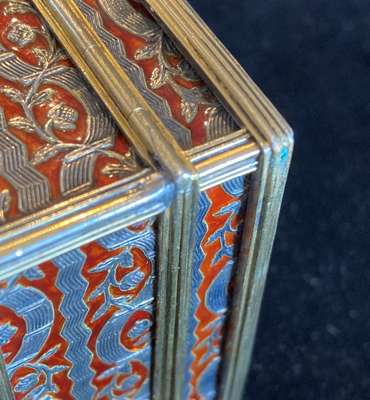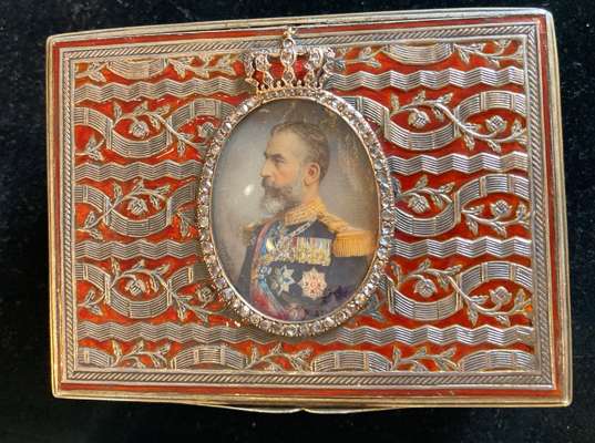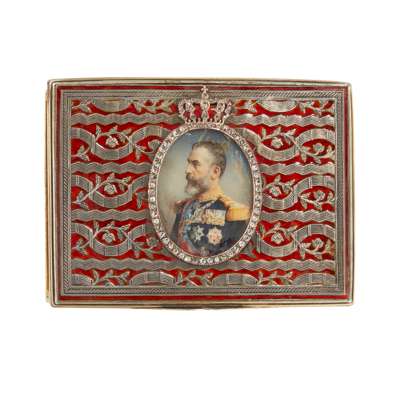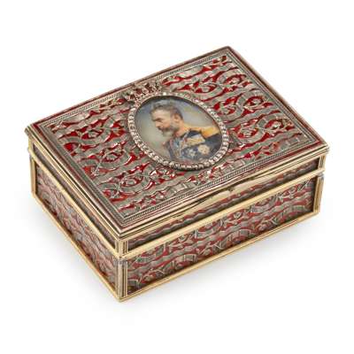 800 standard, of rectangular form, the hinged cover with central oval miniature, possibly Kaiser Wilhelm II, within a rose-cut diamond border, interior gilt, the panels with orange ground enamel and trailing silver foliage strap work detail