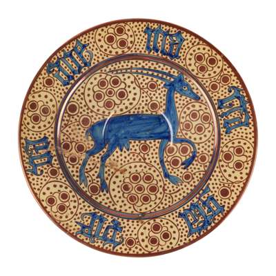 Painted in underglaze blue with an ibex, the rim with a copper lustre and calligraphic border