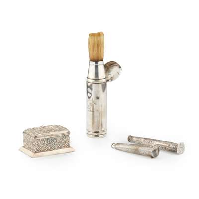 To include: a small stamp box; a small patch box; a German 19th century; a needle case; a seal terminal; a cased shaving brush and a chamberstick (quantity)