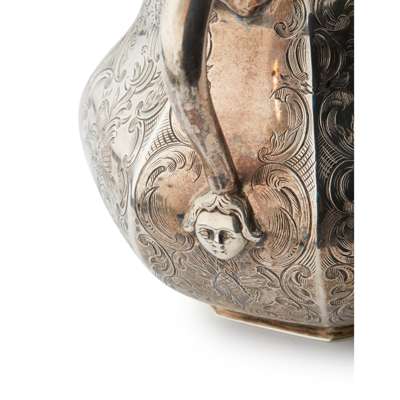 Comprising a teapot, cream jug and sugar basin, all of pear-shaped octagonal form, the panels with engraved foliage, C scroll handles and knopped finial to teapot